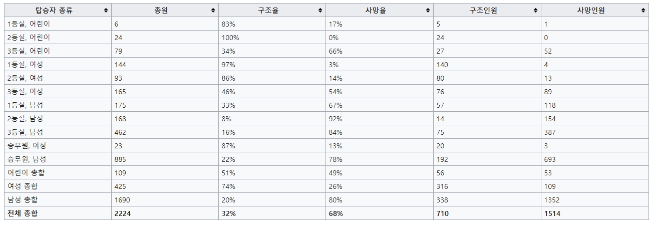 1등실에 탑승한 어린이 중에서는 당시 2살이던 헬렌 로레인 알리슨 양만 유일하게 구조되지 못했으며 2등실에 탑승한 어린이는 전원 구조되었다. 반면 2등실에 탑승한 성인 남자 승객은 168명 중 겨우 14명만 구조되어 92%에 달하는 인원인 154명이 바다에 수장되었다. 부자들과 사회 각계층의 고위인사들은 1등실에 탑승했기 때문에 상당수가 구조되었지만 3등실에 탑승한 이민자들은 과반수 이상이 구조되지 못했는데 특이하게 이민자들보다도 신분이 낮은 하인들이 많이 구조되었다. 하인들의 경우 고위인사들을 보좌하기 위해 1등실에 탑승한 상태였는데 해당 하인의 주인들이 자신의 하인을 구조하라고 승무원들에게 요구했기 때문이었다. 3등실의 생존율이 가장 낮은 이유는 가장 낮은 구역에 위치할 뿐만 아니라 여러 구역이 잠겨 있었고 배에 친숙하지 않은 승객들이 길을 헤맸기 때문일 가능성이 크다. 확인되지는 않았지만 승무원들이 이들을 통제했을 가능성도 있다