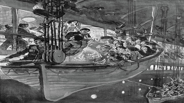 1시 30분경, 배의 앞머리가 잠기기 시작했다 다급해진 승객들은 필사적으로 구명보트를 타기 위해 우르르 몰려왔고 라이 톨러는 5등 항해서 로우에게 허공에 대고 총을 쏘라고 지시한다 혼란을 저지하기 위한 방도였다