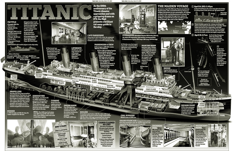 타이타닉호 선내에는 체육과, 수영장 등 호화스러운 부대시설을 갖추고 있었지만 느슨한 규제 때문에 구명정은 20척밖에 없었다 구명정의 정원은 1,178명이었다