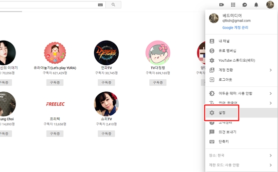 유튜브 홈페이지로 접속을 한다 구글계정 로그인 하고 프로필을 클릭 해서 설정으로 들어간다
